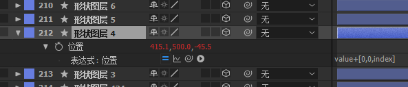 那么厚度怎么做呢?思路是通过线条叠面。首先打开AE的3D视图,在位置处 Alt键 + 左键秒表图标 打开表达式,通过在表达式中写入value+[0,0,index] 大括号保存的是xyz轴的坐标,Index表示当前图层序号,通过ctrl+D不断复制图层就可以将线段叠出厚度。