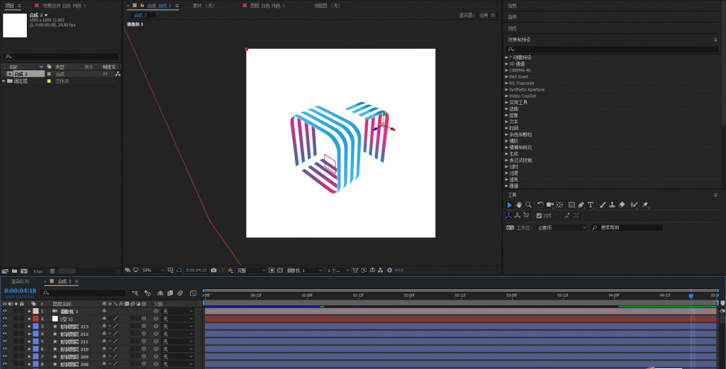 之前的思路貌似不太可行, 我又换了一种思路,通过做画一个带描边的路径,通过坐标位移来生成厚度,之后通过修剪路径来实现动画效果,想到three.js框架很强大,貌似可以用它来做,但是目前还有其他框架在学,腾不出时间学three . js,决定还是用AE来做,于是打开了AE开始整。